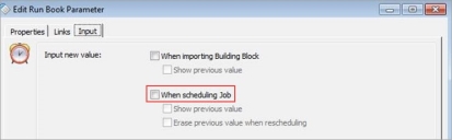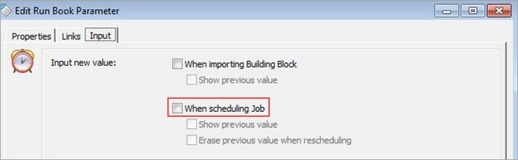 - P_Status: Job status that need to be sent back to Service Manager using the Update Record task. When configuring the run book, ensure that the parameter setting on the Input tab new input value “When scheduling job” is unchecked.
