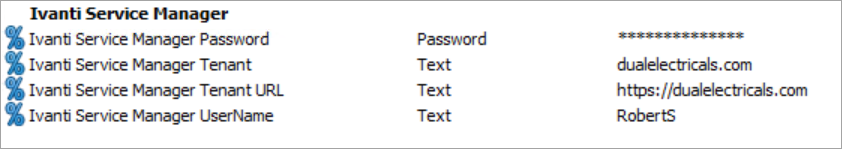•Ivanti Service Manager UserName: User name to connect to the Service Manager Server.