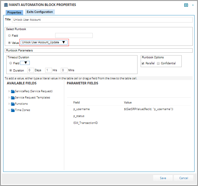 - Depending on the Run Books created in the Ivanti Automation Tool, add or edit the required parameters. For example, for account unlock, only the p_username parameter is required.
