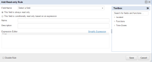 This field is conditionally read only based on an expression | Specifies that the field specified by the Field Name parameter cannot be changed (that is, is read only) depending on the value of the expression. |