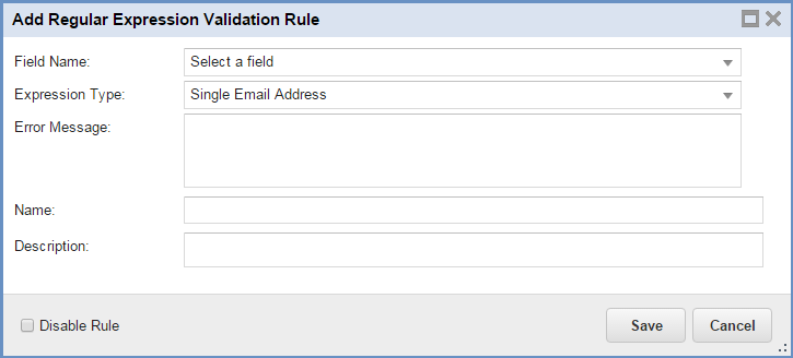 Disable Rule | Specifies if the regular expression validation rule is disabled. |