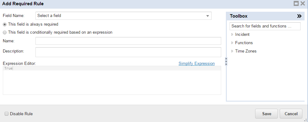 Determine when a rule is required. Required rules can be conditionally required using expressions. For example, the value entered in one field can determine if another field is required or not.