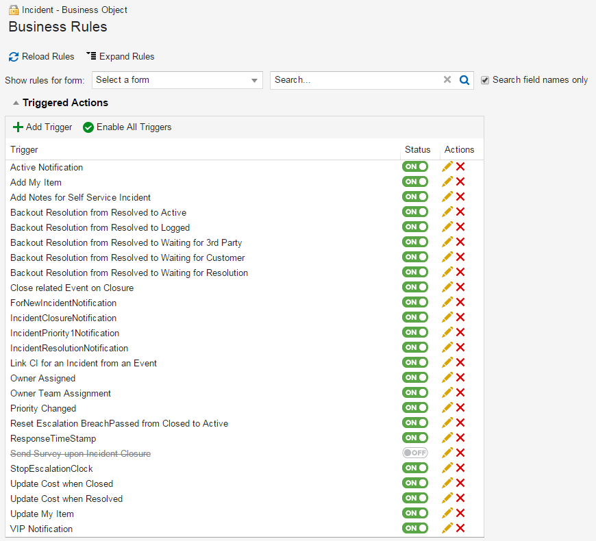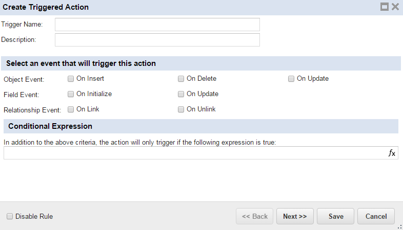 Contain generic rules. They are executed during business object transactions, typically when you save a business object. The trigger is based on one of the events or a combination of events, such as business object events (insert, delete, or update), field events (initialize or update), or relationship events (link or unlink). You can also add an additional filter expression that if provided, is a predicate expression.