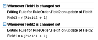 In the figure above, in the first editing business rule, whenever there is a change to field 1, field 2 changes. In the second editing business rule, whenever there is a change to field 2, field 1 changes. This results in a cyclic dependency that cannot be properly evaluated. In this case, there are no final values for field 1 and field 2 and the application cannot calculate the result. However, there are cases where recursive editing rules do produce a definite and useful result and you do not need to avoid these rules.