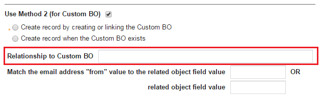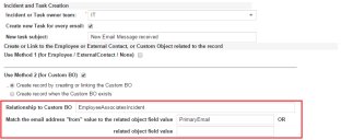 5.In the Match the email address from value to the related object field value field, enter the display name of a valid business object field from the related business object. This value is required. This field cannot be empty when you check Use Method 2 (for Custom BO).