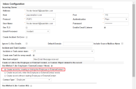 From the Inbox Configuration workspace, select Create record by creating or linking the Employee or External Contact to create a new employee using the incoming email address of a message received from a permitted domain. This option is available whether you select Incident, Problem, or Other from the Email Processor field.