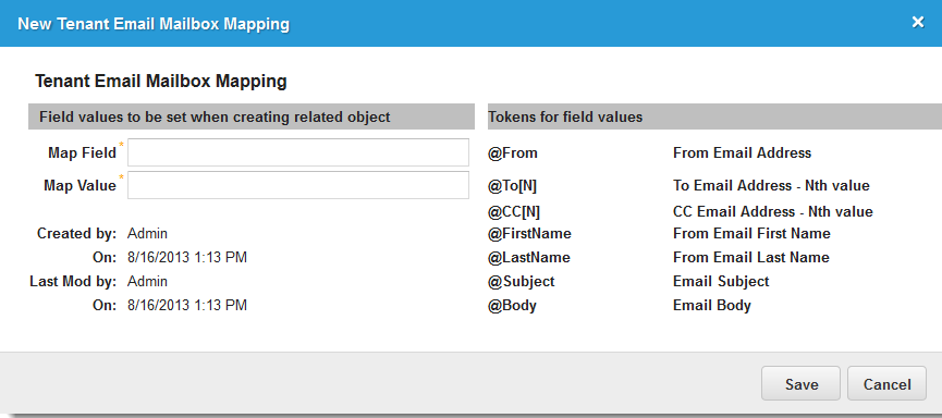 7.In the Field Mapping child tab, click New Tenant Email Mailbox Mapping. The New Tenant Email Mailbox Mapping window appears.
