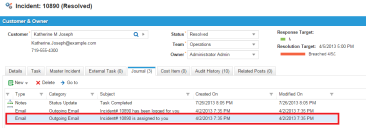 In this example, the last email in the list was generated by a workflow, but you can also track emails created within the incident record (see Using Email).