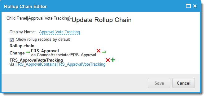 5.From the Child Panels area, click the object of the child panel for which to define a rollup. For example, FRS_ApprovalVoteTracking (next to the Approval Vote Tracking area).
