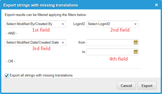 a. In the Export Since column of the Languages workspace, click Export next to the target language to export. The application displays the Export strings with missing translations dialog box.