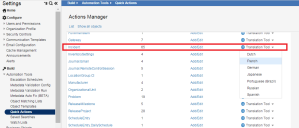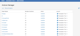 1.From the Configuration Console, click Build > Automation Tools > Quick Actions to open the Actions Manager workspace. The application displays the Actions Manager workspace, listing the business objects that have quick actions.