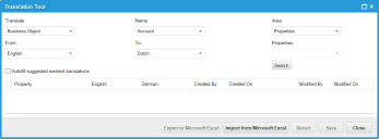 The area to translate. Select from the drop-down list: Properties Fields Lists List Properties Forms Form Properties Searches Quick actions Layouts |