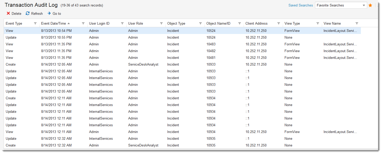 The Transaction Audit log lists create, update, and delete events that are enabled per business object class. It also allows views of business object details to be logged. View logging is enabled per form or form-view.