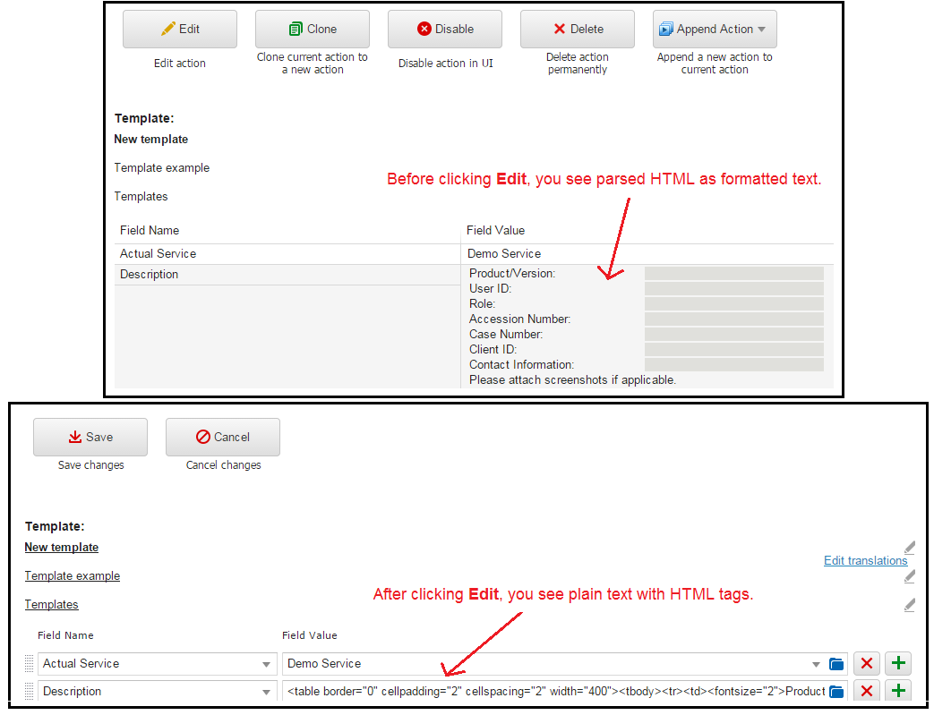 However, when you click Edit to edit the quick action template, you see plain text, with the HTML tags.