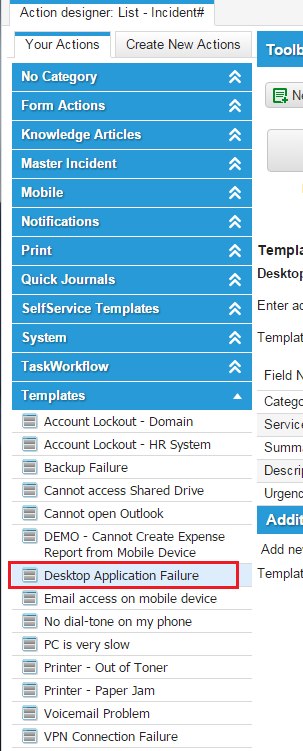 A powerful use for a quick action involves creating a template, which is a record with several fields already completed by default. An example of such a template is the Desktop Application Failure template, used to create incident records when such failures are reported. You can create such a template as part of a form quick action.