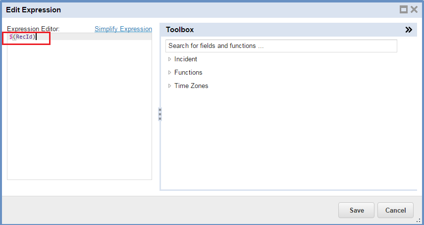 b. In the Expression Editor, enter RecID. The application displays $(RecId).