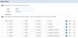 An individual filter can be a single search condition or a group of multiple search conditions. For example, an incident that is considered to be "open" can actually contain a number of different status settings such as logged and resolved. However, you can configure one individual filter to contain multiple parameters. See the figure below.