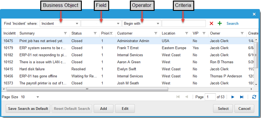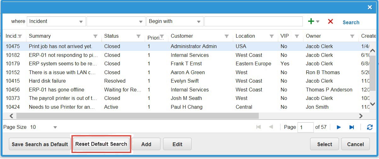 If the values for the Field and the Criteria fields do not have the same data type (for example, if the value for Field is a Boolean and the value for Criteria is text), the application returns an error. If you created a saved search prior to Service Manager Release 2014.3, and that saved search included values with different data types, you get an error if you run the saved search in Service Manager Release 2014.3. If this happens, contact your administrator. The administrator must open the saved search and click Reset Default Search to reset the search. This button is only available to administrators.