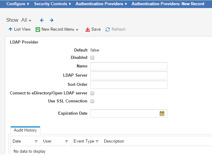 Automatically set by the application. You change this in the list. To make this authentication provider the default, you must first change the Default setting for all other authentication providers to false and then change the Default setting for this authentication provider to true. |