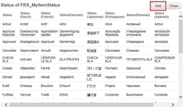 6.In the Status field, click Add, then add the new status such as waiting. To enter a localized value for the new status in any of the available locales, enter the value in the appropriate column.