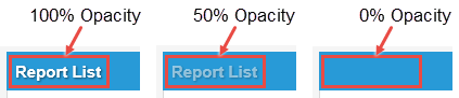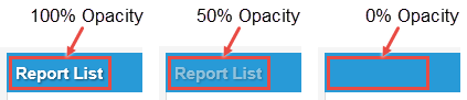 The default alpha (A) value is 100, which means the color you are working with appears in the user interface at 100 percent opacity. For example, say you set the text on the panel header to white with 100 percent opacity and the background to light blue. In the Style Editor, the text appears in white on a light blue background. See 100% Opacity in the example below.