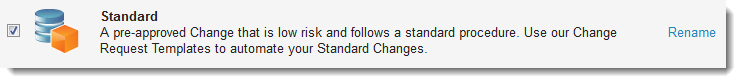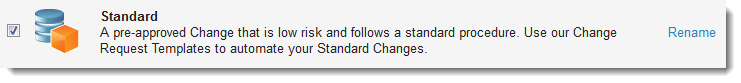 Standard | A preapproved change that is low risk and follows a standard procedure. Use change request templates to automate your standard changes. |