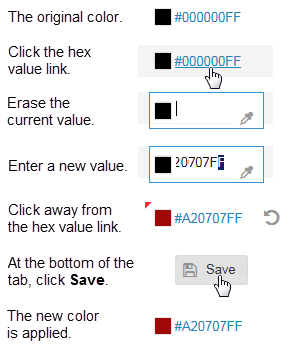 The Style Editor identifies colors by their hexadecimal values and adds two more characters at the right to identify opacity. For example, gray has a hex value of #808080. In the Style Editor, gray is shown as #808080FF. Opacity is applied to a color that is placed above another color in the user interface.