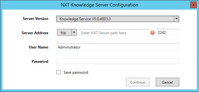1.On the application where you installed Ivanti Service Manager, open the application called Knowledge Import Tool NXT. The application displays the NXT Knowledge Server Configuration dialog box.