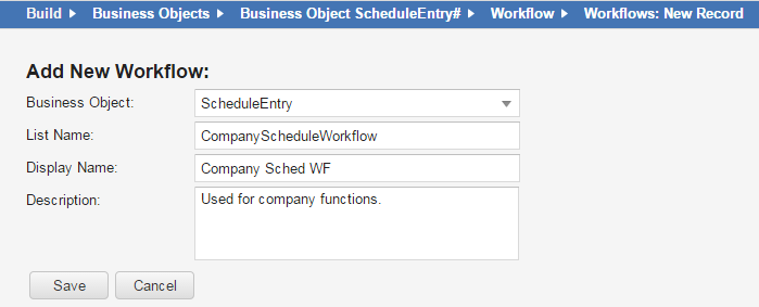 You can import scheduled workflows, such as LDAP synchronization or cost service, into the ScheduleEntry business object. When using a schedule workflow, do not use another business object as a trigger; only use the ScheduleEntry business object to create a workflow that runs at a specific time or interval. See About the Schedule Entry and Scheduled Jobs Workspaces.