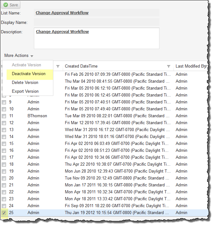 2.Choose a workflow from the list. The workflow version list appears. The active workflow is highlighted in green.