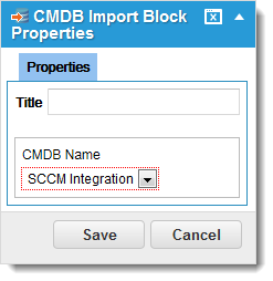The CMDB Import workflow block performs the SCCM integration. It has a parameter that starts the import from SCCM to the Service Manager CMDB. This workflow block submits an integration job but does not keep track of the job status.