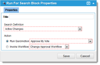 Use the Run for Search workflow block to specify a search that can trigger a quick action or invoke a supplemental workflow. For example, you can run a search for all active incidents, then generate a reminder or escalation notification.