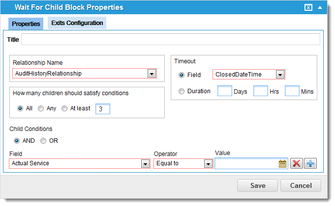 The Wait for Child workflow block waits for one of the following: a condition specified in the block to become true for a child business object, or for a timer to expire. By default, exit ports for this block allow for separate workflow paths based on these events.