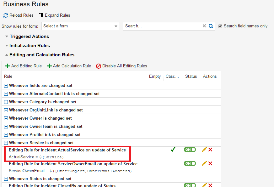 You can also reference a field in the current business object in business rules. For example, the following business rule sets the ActualService field to the value of the Service field in the Incident business object whenever the Service field is changed. The value of the ActualService field is computed by an expression: