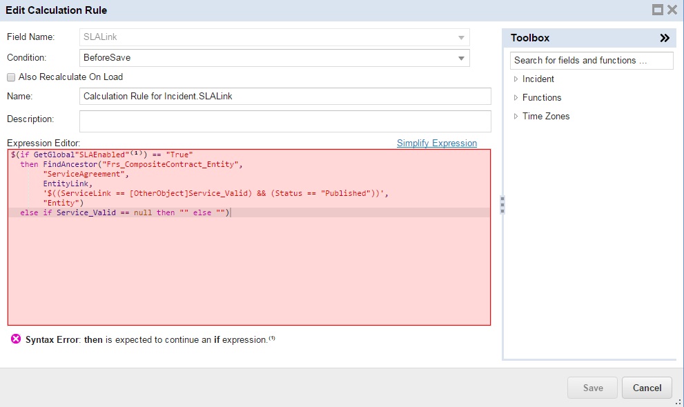 In the following example, the name of the built-in function FindAncestor is misspelled. The expression validator provides an informational error message and does not allow you to save the expression and may also give you a suggestion about which function to use.