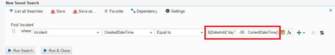 The example above shows how to retrieve incidents from the past 90 days in conjunction with the CurrentDateTime() function.