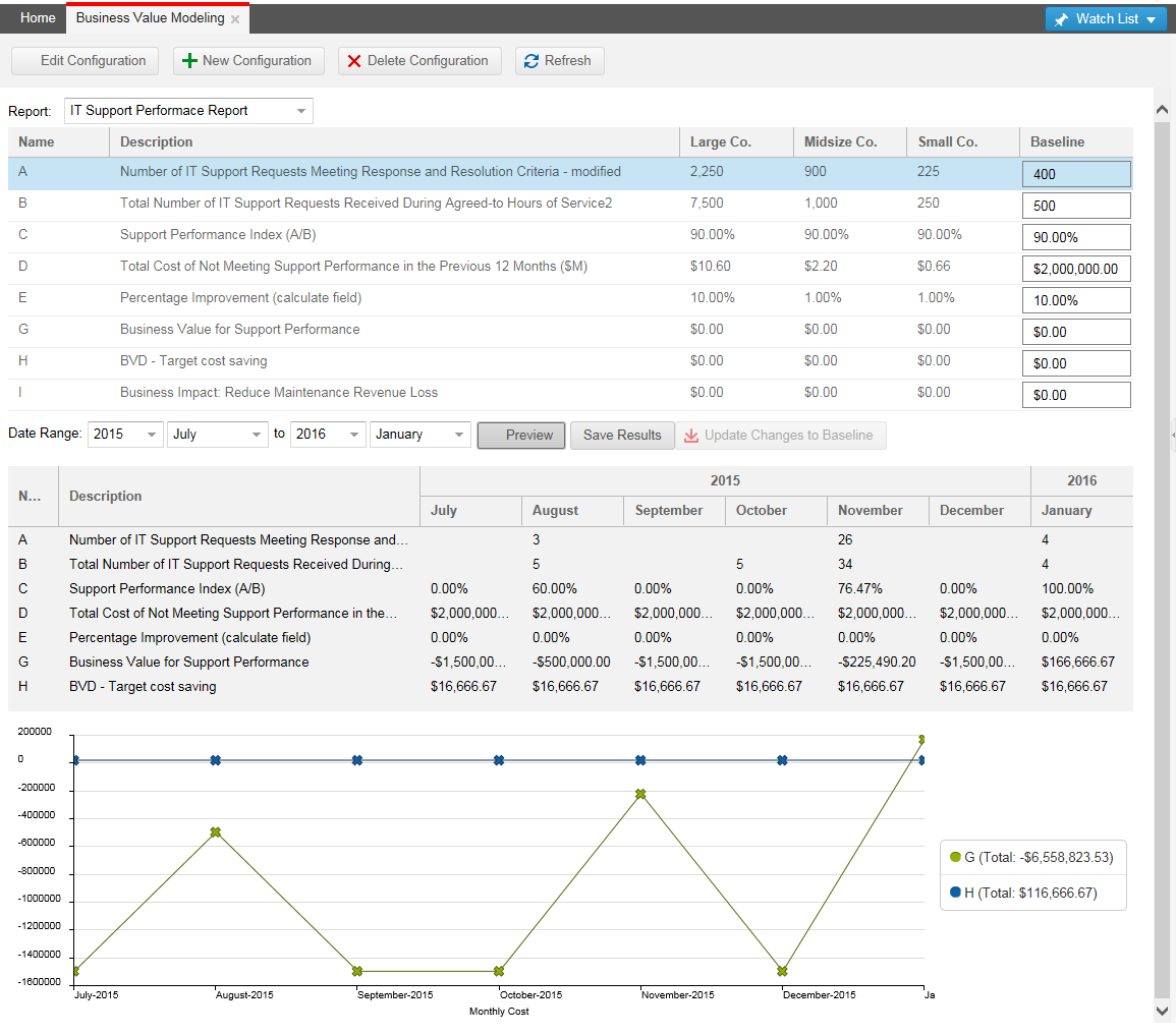 You can evaluate different business values. The Business Value Modeling workspace shows values based on real data. You can also create your own modeling report.