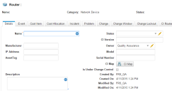 A blank form appears with the following tabs. Not all configuration item types use all tabs. For example, a configuration item record for a switch will contain the CI Switch Map Tree tab, whereas a record for a printer will not.