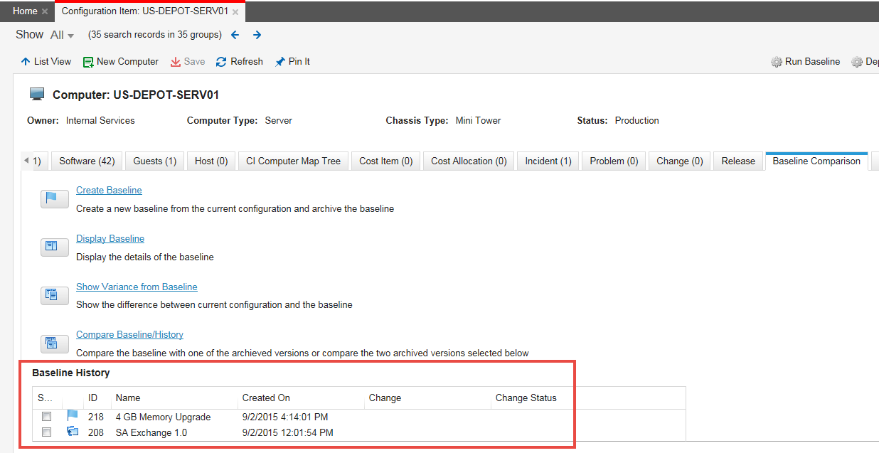 If the configuration item is related to a change, the baseline automatically runs when the change status is set to implemented. If necessary, the baseline can be run at any time by clicking the Run Baseline quick action from the Change workspace.