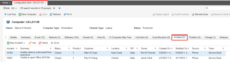 Incidents, problems, changes, and releases can be created or linked from the Configuration Management workspace. If the configuration item record was created from an incident, problem, change, or release, then the record appears under the corresponding tab.
