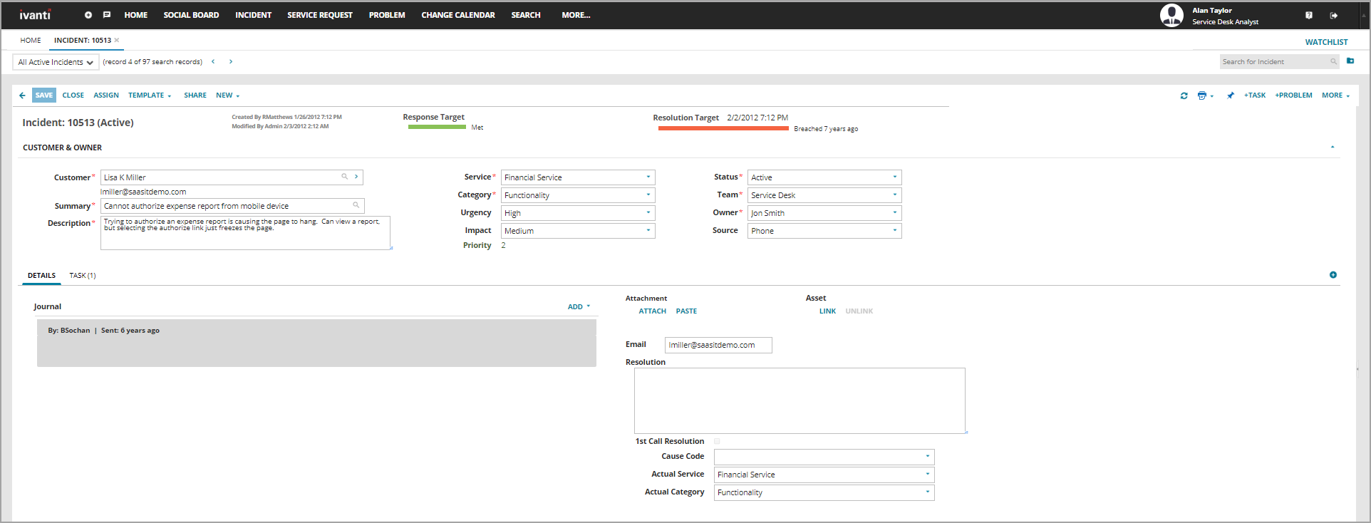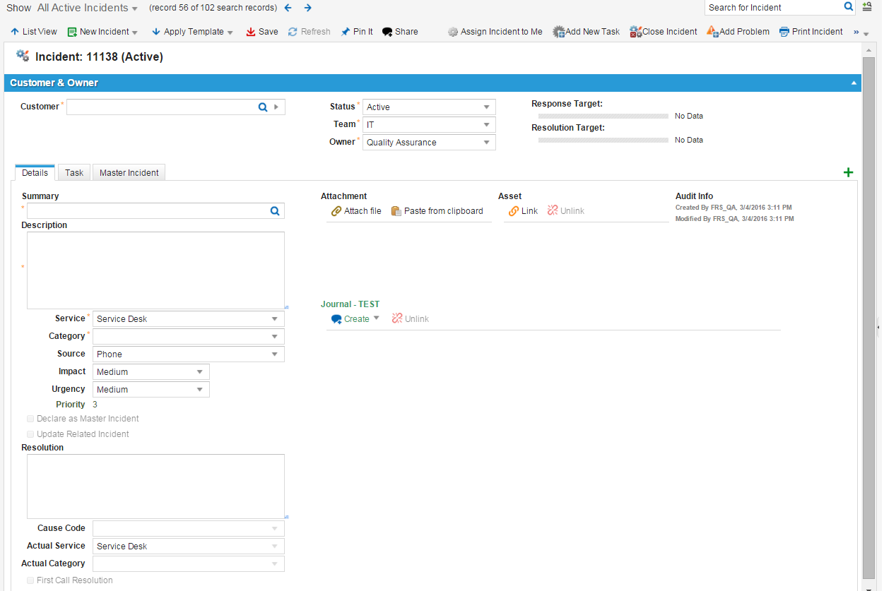 Journal | Contains comments or notes about this incident. See Adding a Journal Entry to a Business Object. |