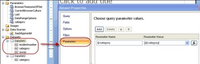 6.Enter your query. For example, a simple query to get all incidents by categories, showing the incident number and owner is as follows: Select incidentnumber,category,owner from incident where category in (@category). In this example, @category is taken by Microsoft SSRS as a parameter. When running the query, the system prompts you for the value. You can provide any value to test the query. The system automatically creates the category parameter and automatically maps it to the dataset.