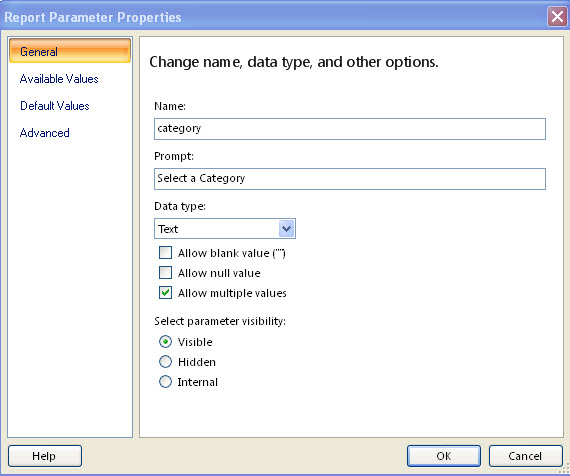 4.In the Report Parameter Properties dialog box, click General on the left.