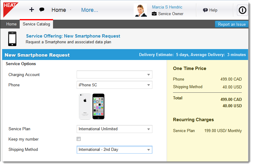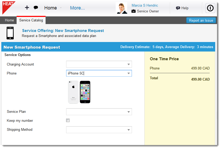 This user makes a request for a new smart phone. The price appears and the total is automatically calculated in Canadian dollars (CAD).
