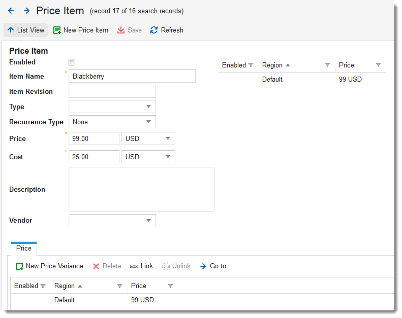 3.From the toolbar, click New Price Item. A blank price form appears.