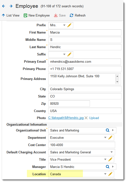 The following employee has a location of Canada (and a primary address in Colorado which is ignored because the location is Canada):