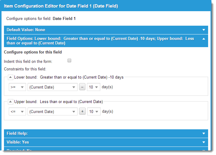 1.Within the Item Configuration Editor of a date, time, DateTime, text, money, or mask field, expand the Field Options area.