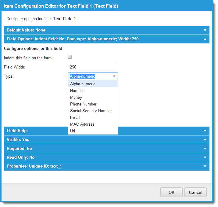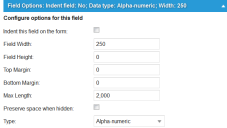 1.Within the Item Configuration Editor for a text, number, or mask control, expand the Field Options area.