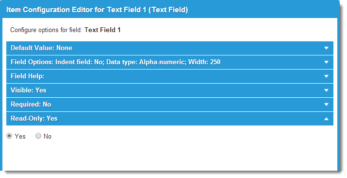 To make a control read-only, within the Item Configuration Editor, expand the Read-Only area and select Yes. Click OK.