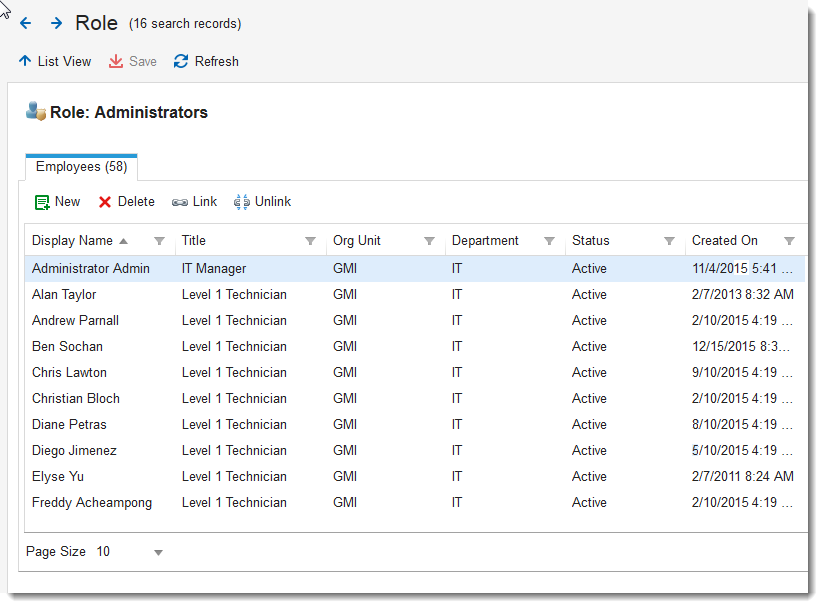 For information on adding users to a role, or linking and unlinking users, see Linking Roles to an Employee.